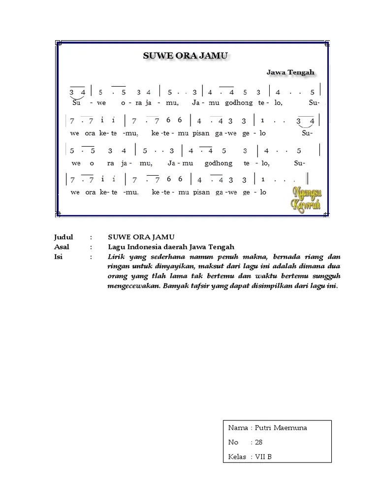 Lirik lagu suwe ora jamu. Lagu ini sangat populer, apalagi setelah dinyanyikan oleh . Lirik lagu suwe ora jamu, lagu daerah jawa tengah dan daerah istimewa yogyakarta (diy). Not angka suwe ora jamu oras, math, musik, math resources, mathematics. 3 4 5 5 4 5. Jamu godhong telo, suwe ora ketemu. Lagu ini jadi lagu daerah provinsi jawa tengah dan daerah istimewa yogyakarta. Pastikan anda sudah melihat video musiknya. Lagu 'suwe ora jamu' diciptakan oleh r.c. Lengkap dengan arti dan maknanya. Bahkan lirik lagunya ada pesan dan amanat tersirat,walaupun lagu nya singkat dan padat tetapi sangat memuat makna dalam nilai moralnya. Di balik lagu pendek ini, ternyata ada . Suwe ora jamu jamu godhong tela suwe ora ketemu.